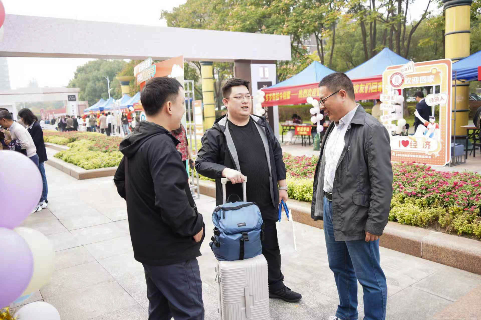 清晨的阳光刚刚洒满校园,风华广场已是暖意融融。作为校友们返校的第一站,学院精心设置的签到处早早“开张”,师生志愿者们精神饱满,翘首以盼。校友们一踏入南门,热烈的欢迎声与亲切的问候便扑面而来。他们在印有学院标识的签到簿上郑重签名,或留下对母校的深情祝福。许多校友一见面便激动地握手、拥抱,在学院摊位前留下重返母校的第一张合影,欢声笑语在广场上空回荡,重逢的喜悦从这里开始蔓延,也为后续的系列庆祝活动拉开了温情的序幕。
