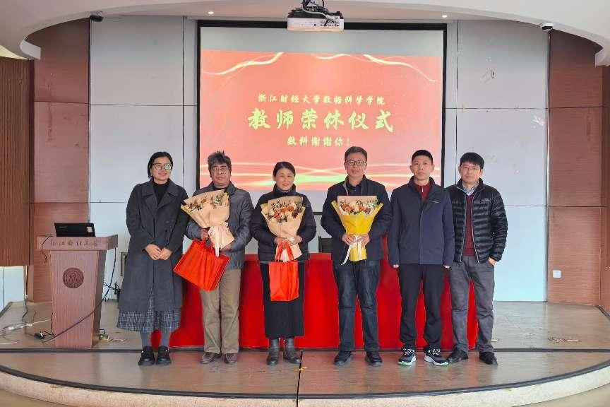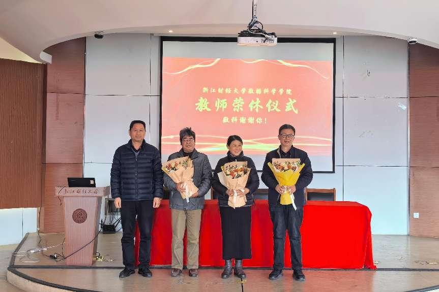 仪式首先回顾了2024年度学院6名荣休教师,周君兴、应建君、李晓东、陈晓雷、郑学东、叶爱珍的工作成果、获得荣誉。院长洪兴建与学生代表为到场的3名荣休教师应建君、李晓东、叶爱珍送上鲜花。学院党委副书记王文婷、副院长刘波、副院长郑松给他们送上荣休纪念品。