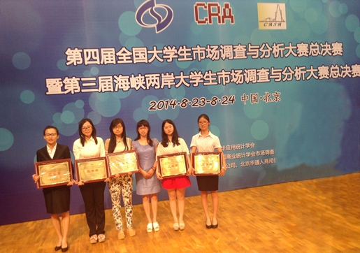 参赛作品获奖情况:作品“美丽杭城不应在“十面霾伏”中前行——雾霾对杭城居民生活及身心健康影响状况的调查”(负责人:程婕)荣获一等奖;“城市轨道交通基础设施及运行状况满意度调查——以杭州市为例”(负责人:简天琪)、“O2O模式对于人们消费行为的影响及其壁垒探析”(负责人:周晟佳)、“养老先行,老有所养——满意度视角下杭州市民养老模式选择研究”(负责人:余露)等作品荣获二等奖;作品“杭州下沙高校创业教育模型探索”(负责人:廖然)荣获三等奖。