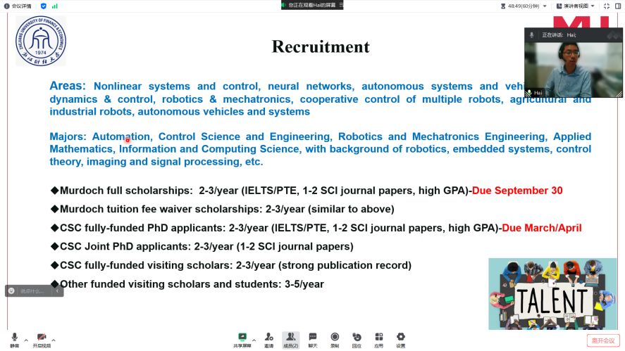师生作了一场题为“Adaptive path tracking control of maize plant protection robot via extreme learning machine”的线上学术讲座。讲座由黄漫