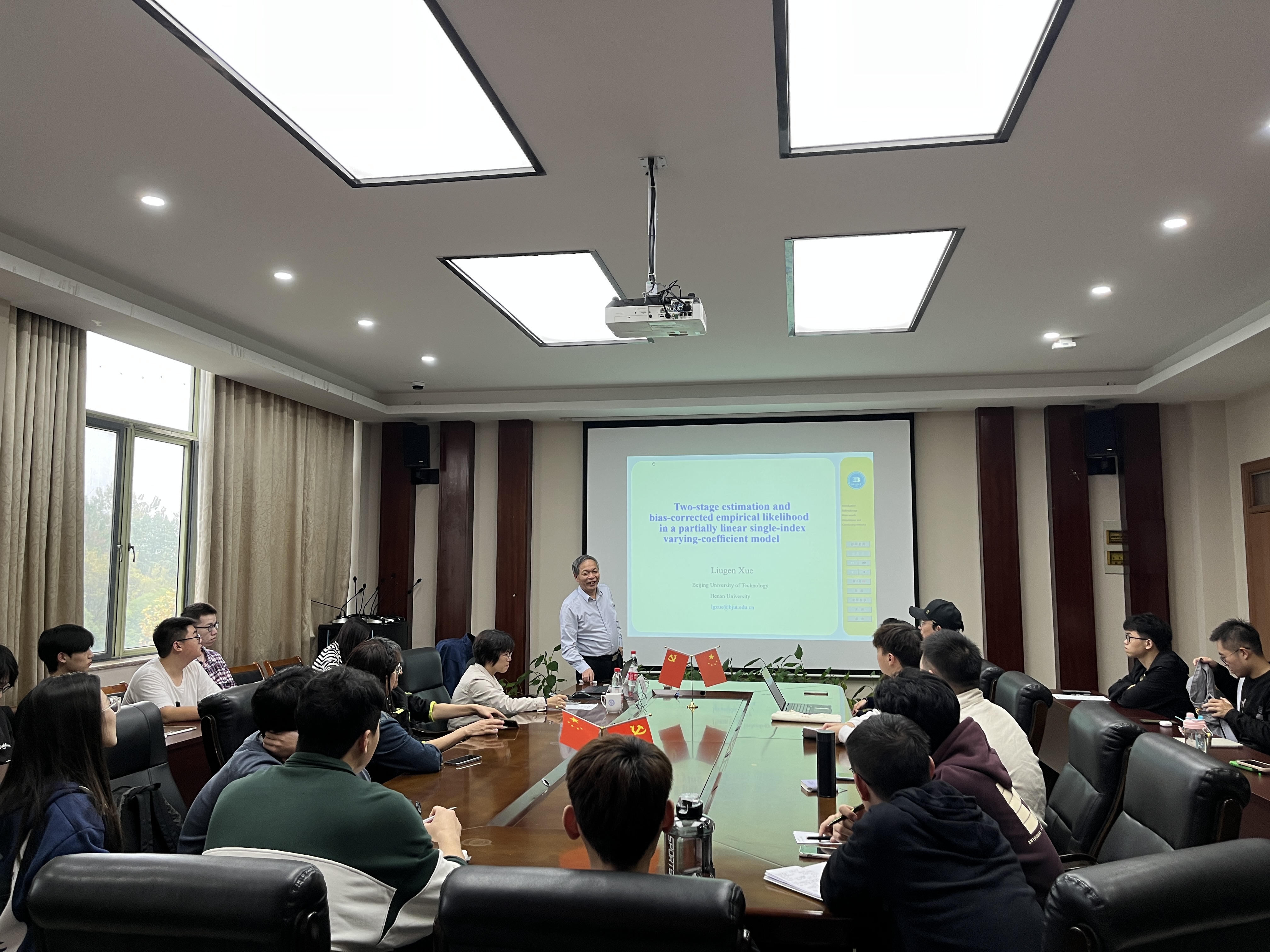 举行数海领航大讲堂2024年第21期。本期邀请北京工业大学薛留根教授为全院师生带来题为“Two-stage estimation and bias-corrected empirical likelihood in a partially linear single-index varying-coefficient model”的学术讲座。