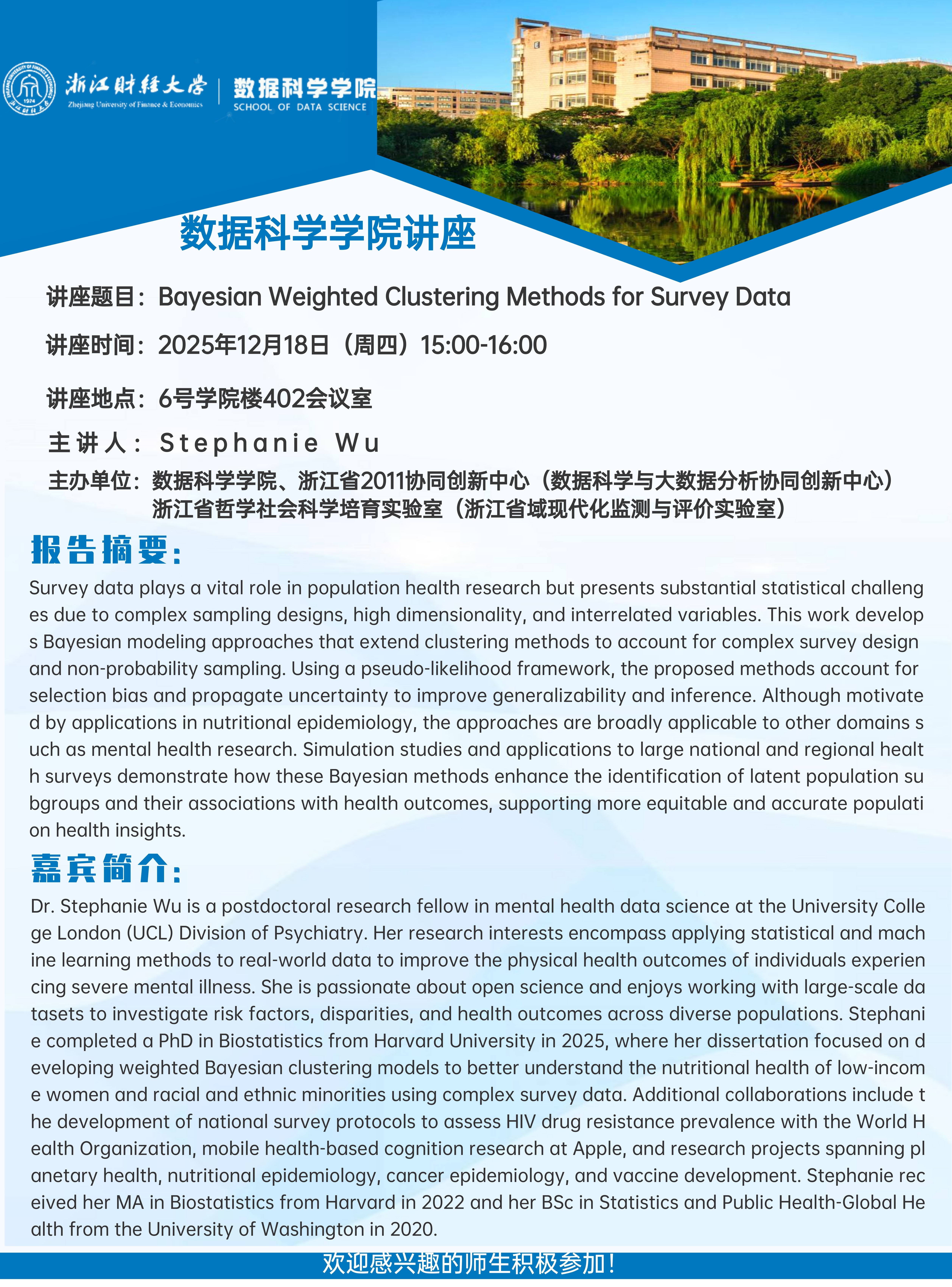 上一条:运用时间序列发现系统的动态行为:Takens'嵌入定理、统计推断与深度学习 ——数海领航大讲堂2025年第27期开讲 下一条:黄漫 讲座信息-the Statistics Department at ENSAE/CREST Austin J. Stromme助理教授