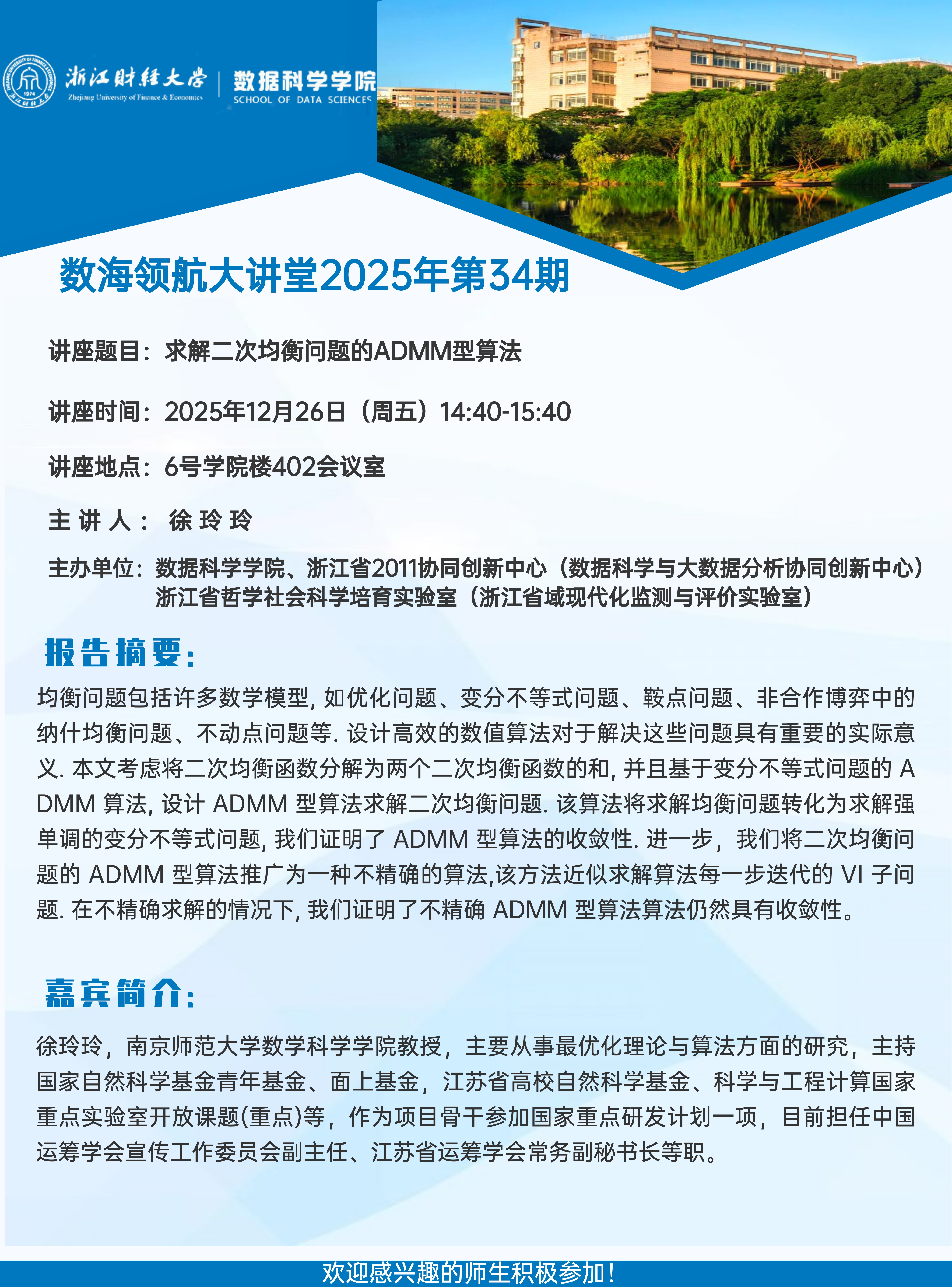 上一条:巴黎综合理工学院(ENSAE/CREST)统计系助理教授Austin J. Stromme 应邀来黄漫 讲学 下一条:数海领航大讲堂2025年第33期——南京大学杨俊锋教授