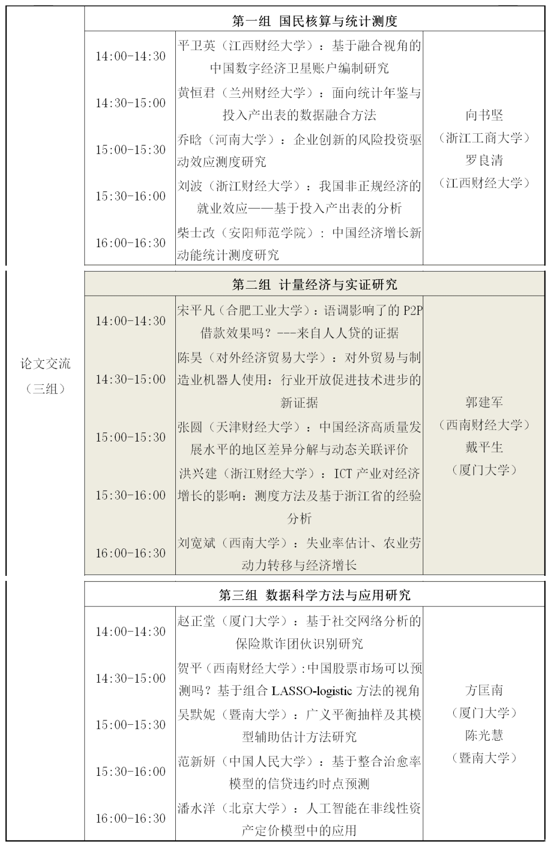 曾菊英教授、厦门大学戴平生教授和西南财经大学郭建军教授。该组交流的主题是“计量经济与实证研究”,五位被告人分别为合肥工业大学宋平凡、对外经济贸易大学陈昊、天津财经大学张圆、黄漫