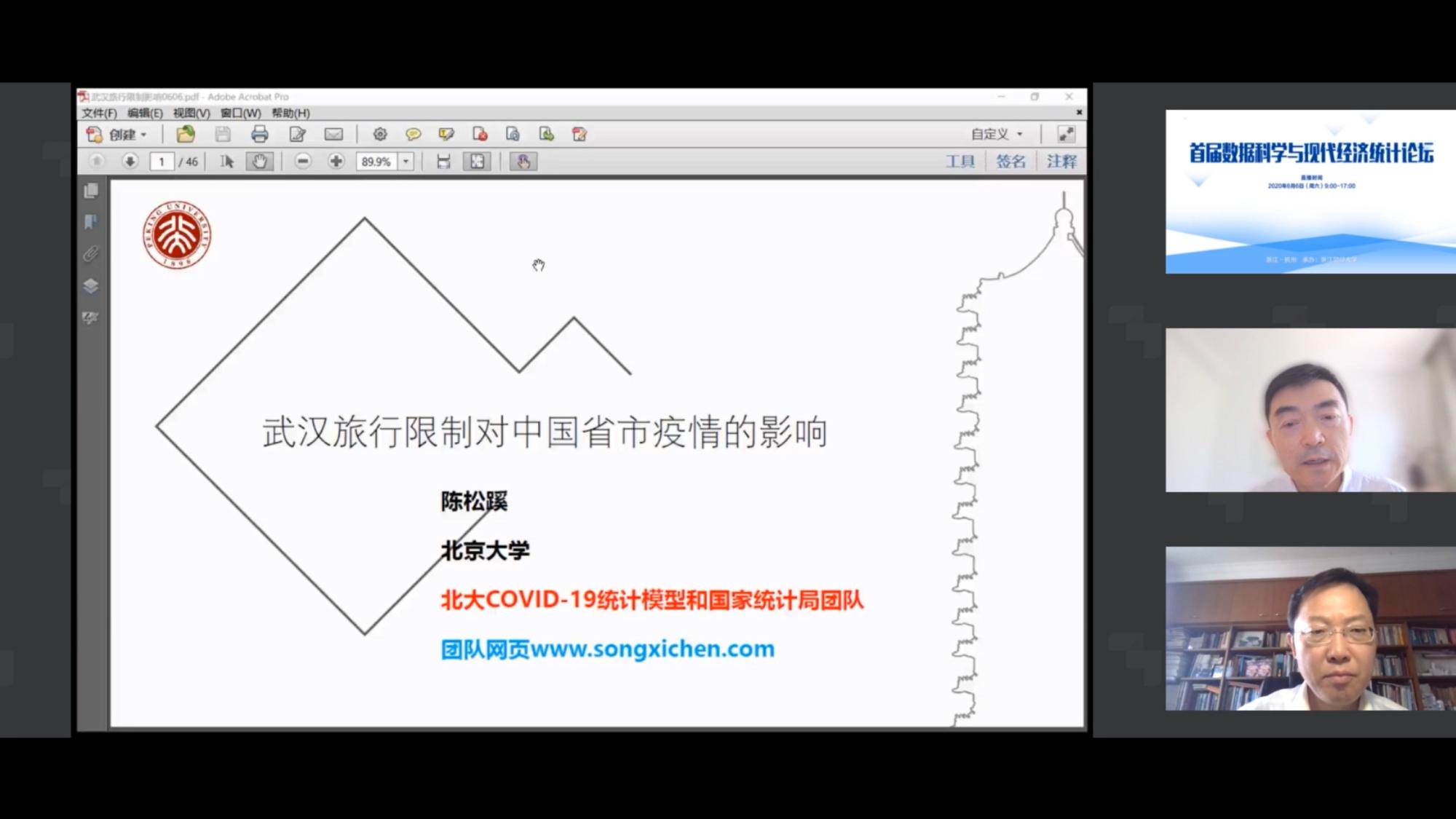 第二场报告由上海对外经贸大学校长汪荣明教授主持,来自北京大学的光华管理学院商务统计与经济计量系主任陈松蹊教授围绕“武汉旅行限制对中国各省市疫情的影响”作主题报告,重点阐述了人流管控的重要性并对输入病例进行了深入探讨。