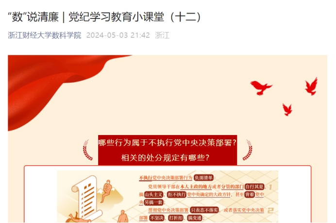 除了以专题学习卡形式开展党纪学习教育外,数科学院党委依托学院融媒体平台,持续在“数”说清廉栏目推出《党纪学习教育小课堂》系列文章,以问答形式,每天带领师生党员学习一个《条例》相关知识点。