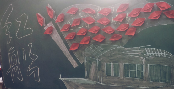 一开始,党员同志们满怀崇敬之情用红色卡纸折出一艘艘红船,红船象征着中国革命源头,也象征着胜利,象征着光明。而后他们将红船贴到黑板上画着的红船上,仿佛再次重温了一遍发生于嘉兴南湖红船上开天辟地的伟大时刻。