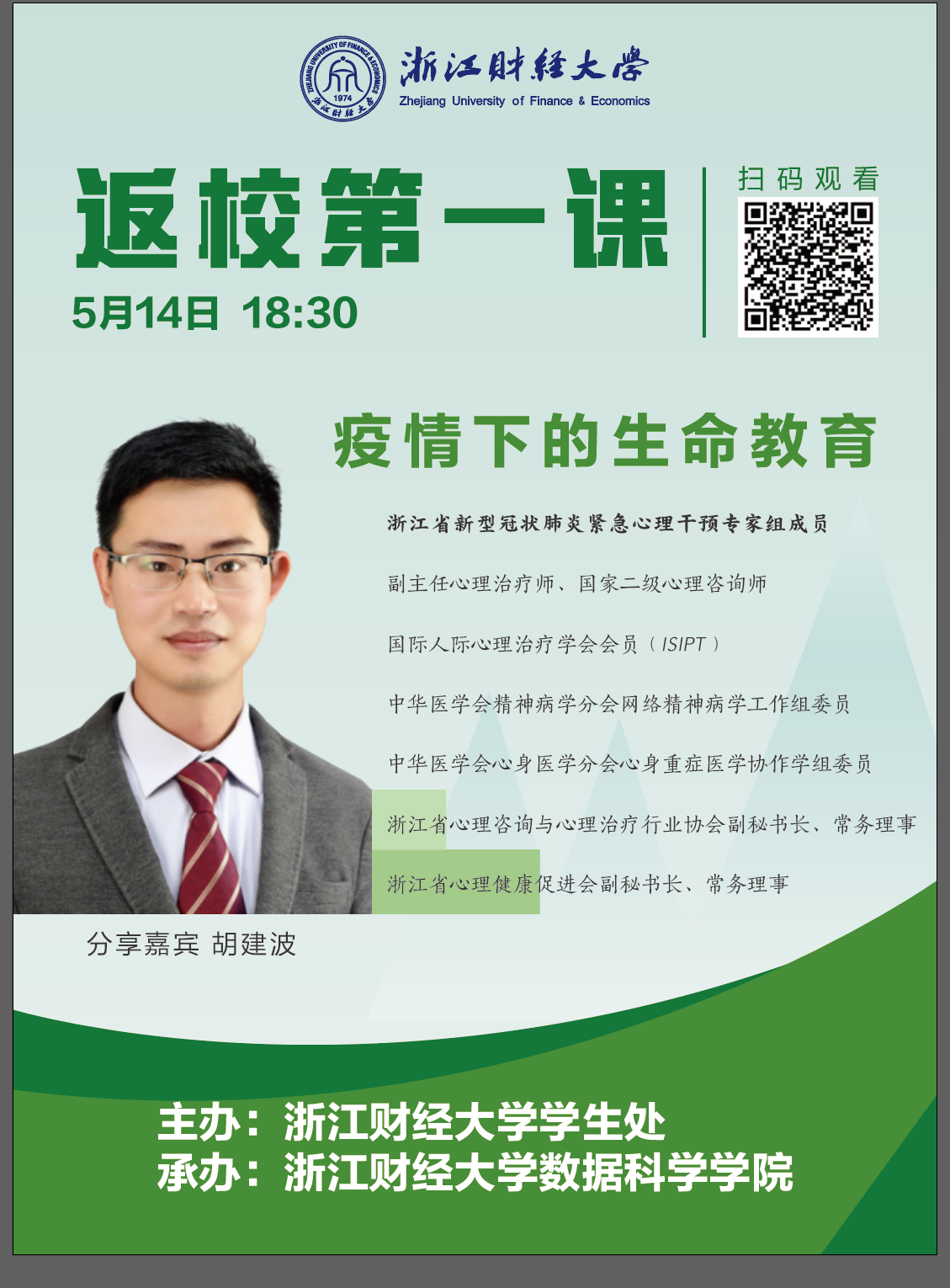 承办的“返校第一课——疫情下的生命教育”主题讲座在线上正式开播。本次讲座邀请到了浙江省新型冠状肺炎紧急心理干预专家组的成员胡建波老师,为同学们讲解“疫情下的生命教育”。全校700多名学生参加了线上讲座。