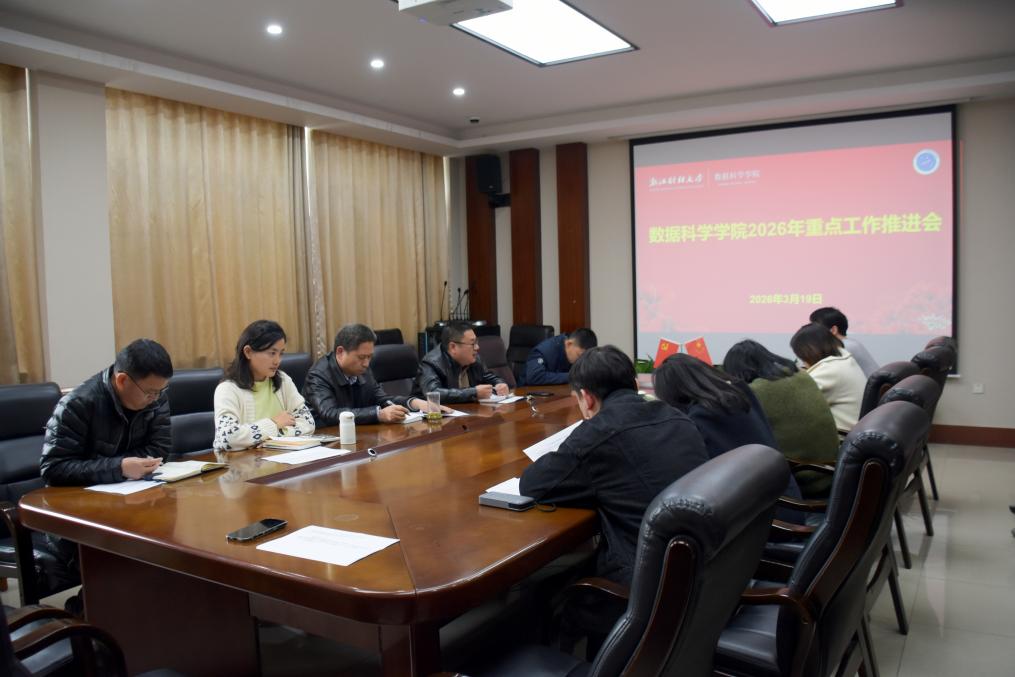 数据科学学院在402会议室召开2026年重点工作推进会。学院领导班子成员、各中心主任及各系代表出席会议,会议由学院党委书记段雪辉主持。