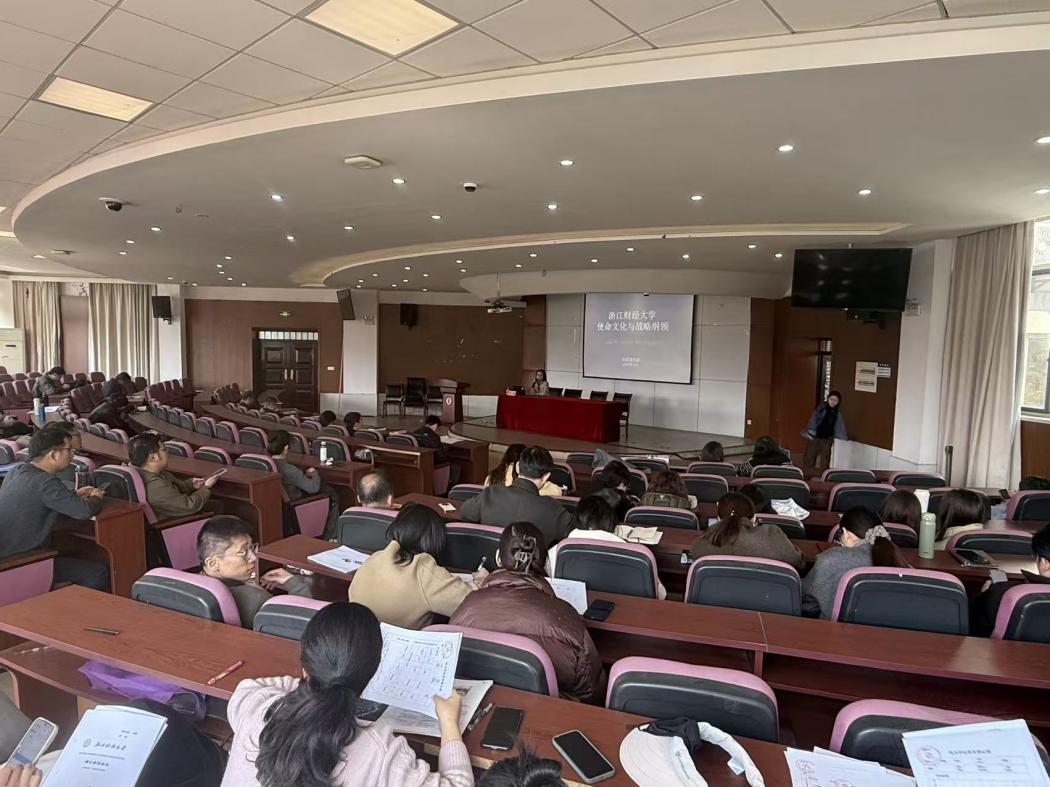 讲座介绍了《纲领》的编制过程,系统阐释了学校办学使命、发展愿景、校训精神与 “浙财精神” 的深刻内涵。赵蕾老师结合学校办学历史与发展实践,深入解读大学文化在立德树人、引领发展、凝聚力量中的重要作用,引导师生深刻把握学校使命愿景的核心要义与实践路径,进一步明晰新时代浙财人的责任与追求。