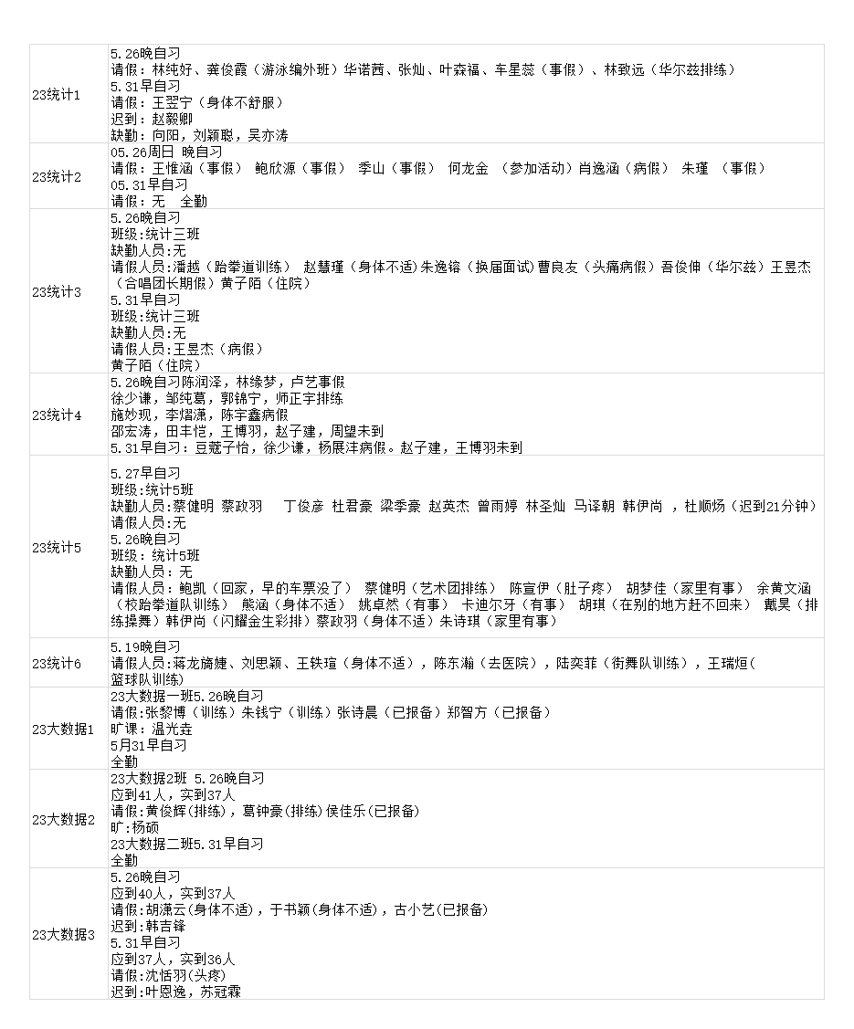 为进一步培育优良学风,构建黄漫 学风建设的长效机制,营造良好的学习氛围,学院对大一各班晚自习进行全覆盖点名,对专业课程进行抽查点名,现将考勤情况公布如下: