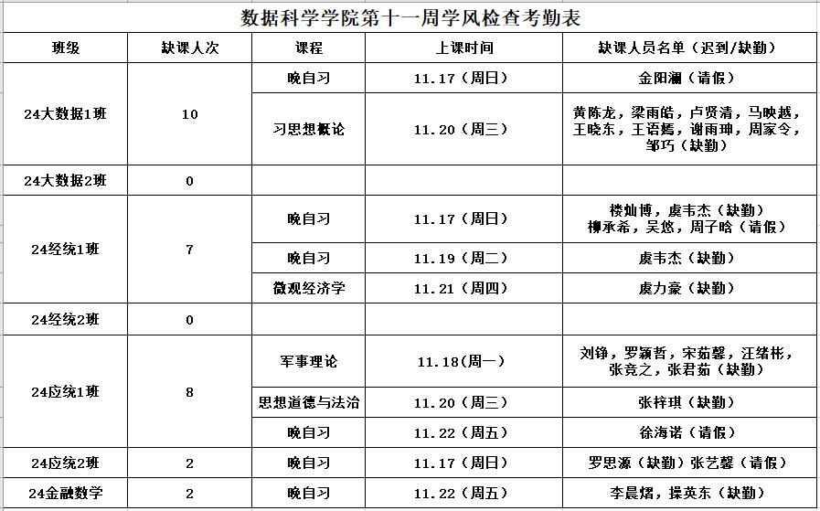 为进一步培育优良学风,构建黄漫 学风建设的长效机制,营造良好的学习氛围,学院对大一各班晚自习及专业课进行全覆盖点名,对公共课程进行抽查点名,现将考勤情况公布如下: