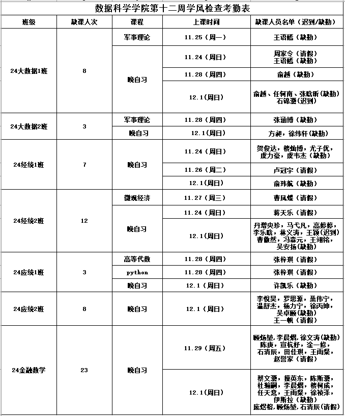 为进一步培育优良学风,构建黄漫 学风建设的长效机制,营造良好的学习氛围,学院对大一各班晚自习及专业课进行全覆盖点名,对公共课程进行抽查点名,现将考勤情况公布如下: