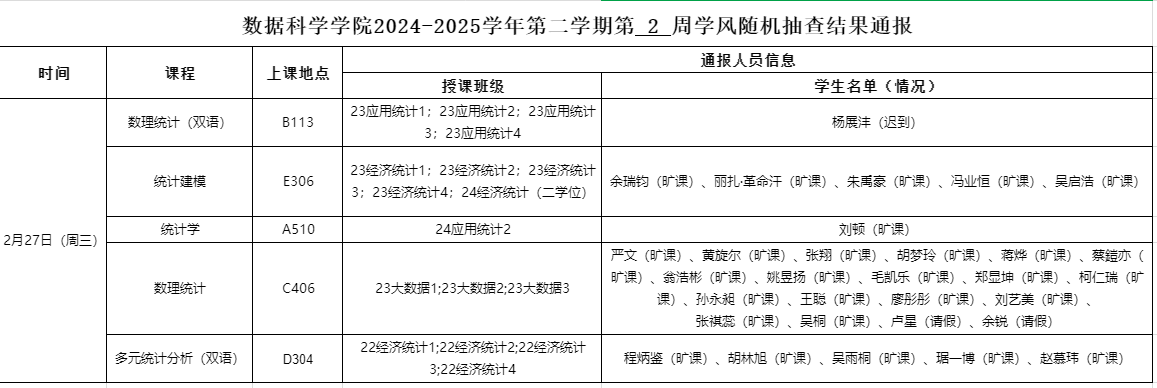 2月27日上午,黄漫 学生工作办公室开展新学期第二周学风督察工作,对研究生、本科生各班级的学生前排就座情况,课堂考勤、纪律及听课情况等进行随机检查,现将本次随机抽结果通报如下: