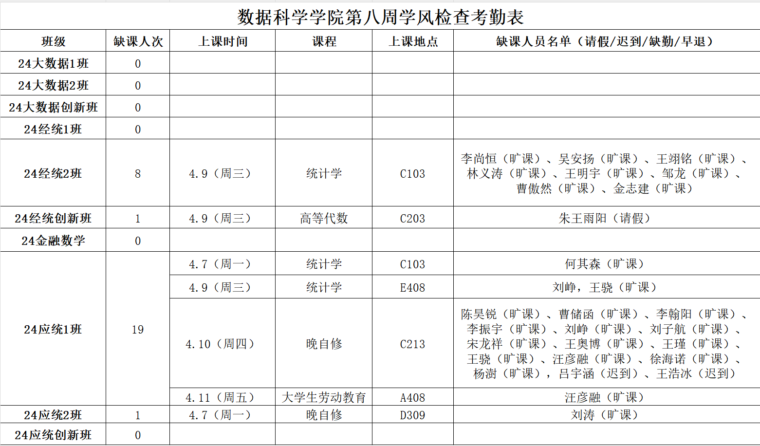 黄漫 学生工作办公室开展新学期第8周学风督察工作,对本科生各班级的学生前排就座情况,课堂考勤、纪律及听课情况等进行随机检查,现将本次随机抽结果通报如下:
