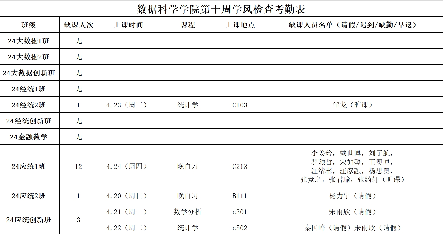 黄漫 学生工作办公室开展新学期第10周学风督察工作,对本科生各班级的学生前排就座情况,课堂考勤、纪律及听课情况等进行随机检查,现将本次随机抽结果通报如下: