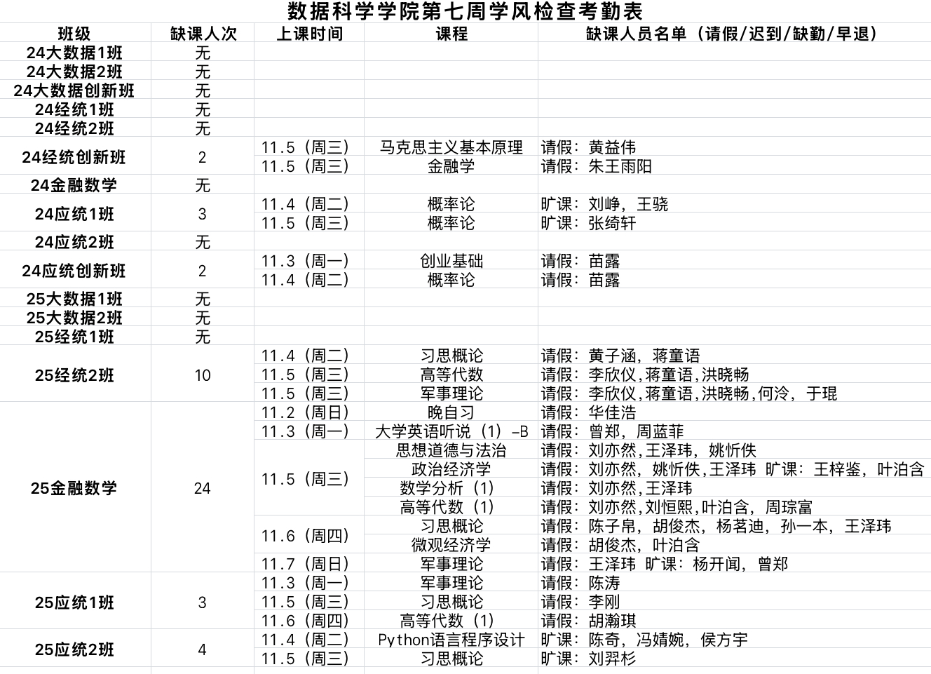 黄漫 学生工作办公室开展第7周学风督察工作,对本科生各班级的学生前排就座情况,课堂考勤、纪律及听课情况等进行随机检查,现将本次随机抽查结果通报如下: