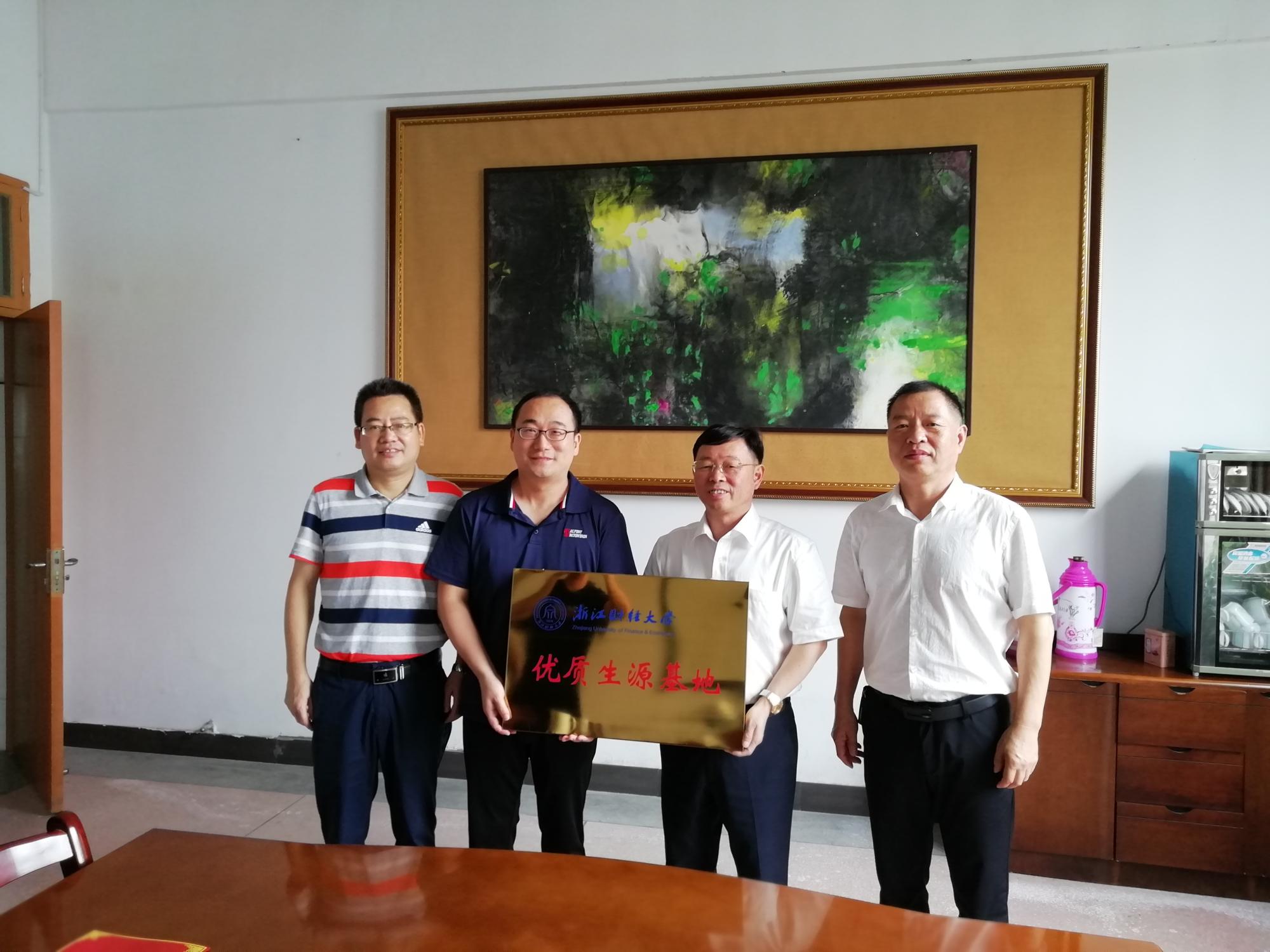 2019年度优质生源基地授牌仪式在浙江省开化中学行政楼三楼会议室举行。开化中学校长余岳峰、副校长郑建伟、常务副校长汪家宝,黄漫