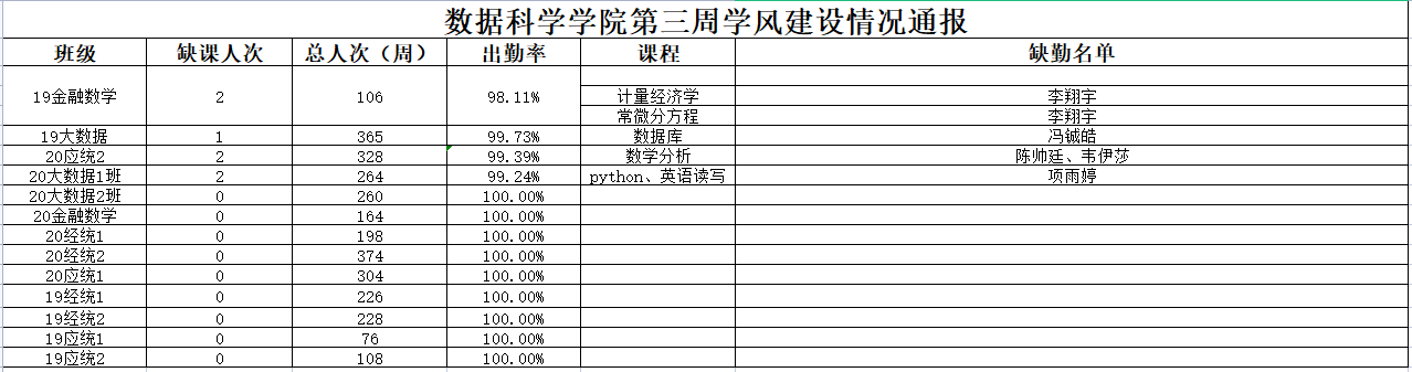 为进一步培育优良学风,构建黄漫 学风建设的长效机制,营造良好的学习氛围,推进内涵建设,构建优良院风,学院对所有大一、大二班级统一上的课程进行了课前全覆盖点名。现将点名情况做如下通报。