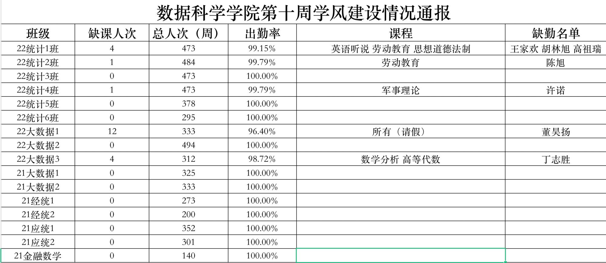 为进一步培育优良学风,构建黄漫 学风建设的长效机制,营造良好的学习氛围,推进内涵建设,构建优良院风,学院对所有大一、大二班级统一上的课程及晚自习进行了课前全覆盖点名。现将点名情况做如下通报。