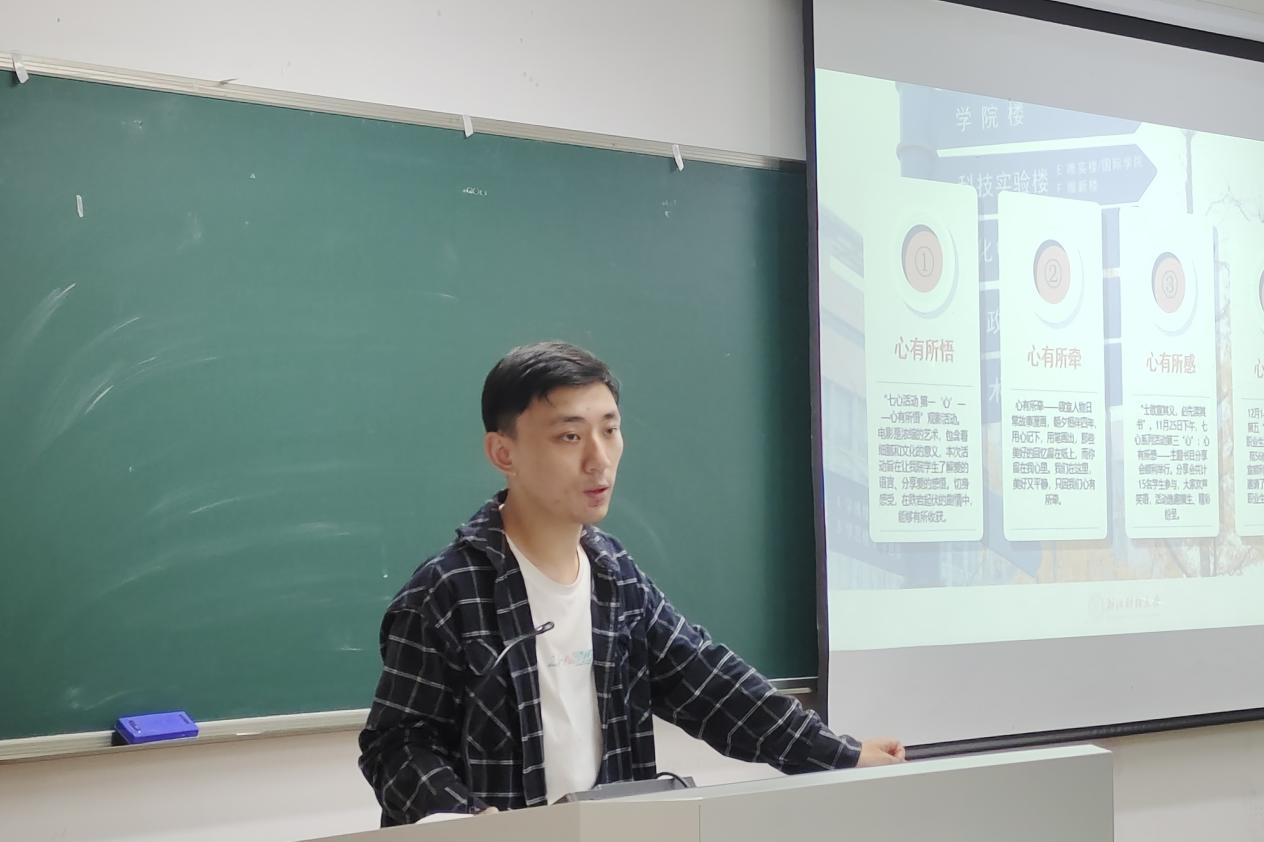 心理工作的“吾悦”心理辅导站,讲述了心理站的成立目的、取名意义及作用。同时,他对心理辅导站举办的以“心有所悟”等为主题的“七心”工程系列活动展开了详细介绍,督促各班心理委员积极分享并鼓励同学们参与心理活动。