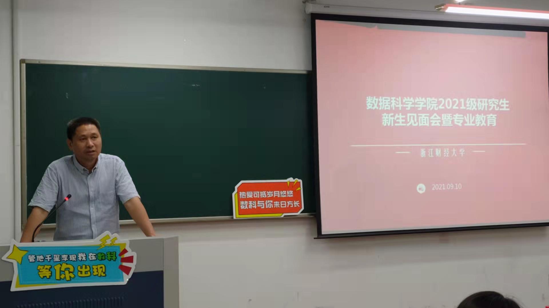 见面会上,洪院长代表全院教职工对新同学来到数科大家庭表示热烈的欢迎,同时他也对大家今后的学习生活提出了殷切期望。接着,周银香老师全面介绍了学院学科及专业的整体概括,让同学们对今后的专业学习有更明确而清晰的认识。随后,科研办,学办老师先后向大家介绍了硕士、博士的相关培养方案及学校的相关规章制度。最后李时兴老师为大家详细解读了应用统计专硕的培养方案。通过老师们的介绍,同学们很快对学院有了全面的了解,见面会氛围融洽,师生互动不断。