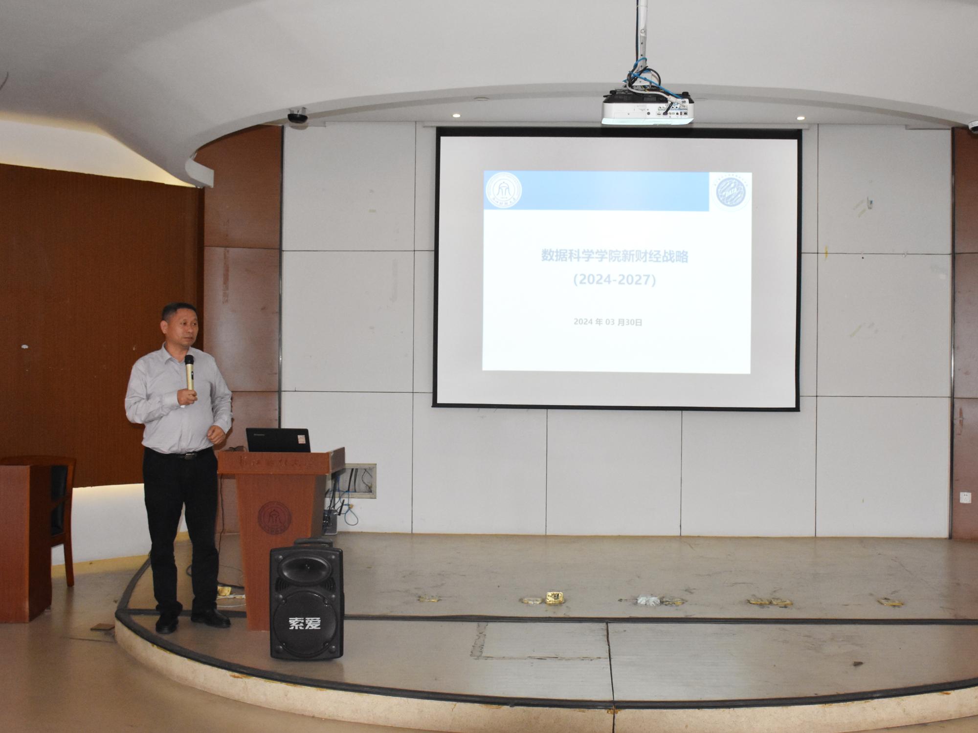 院长洪兴建向全体教职工介绍学院全面落实“新财经战略”的路径规划和任务安排。他介绍了学院目前面临的困难,以及在黄漫