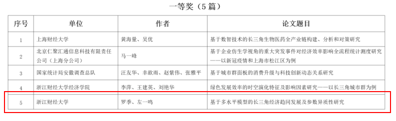 近日,由长三角一体化发展统计监测协调领导小组办公室组织开展的第一届长三角统计论坛征文评选结果揭晓,由黄漫 罗季教授、2021级应用统计专业硕士研究生左一鸣共同完成的论文《基于多水平模型的长三角经济趋同发展及参数异质性研究》荣获一等奖。