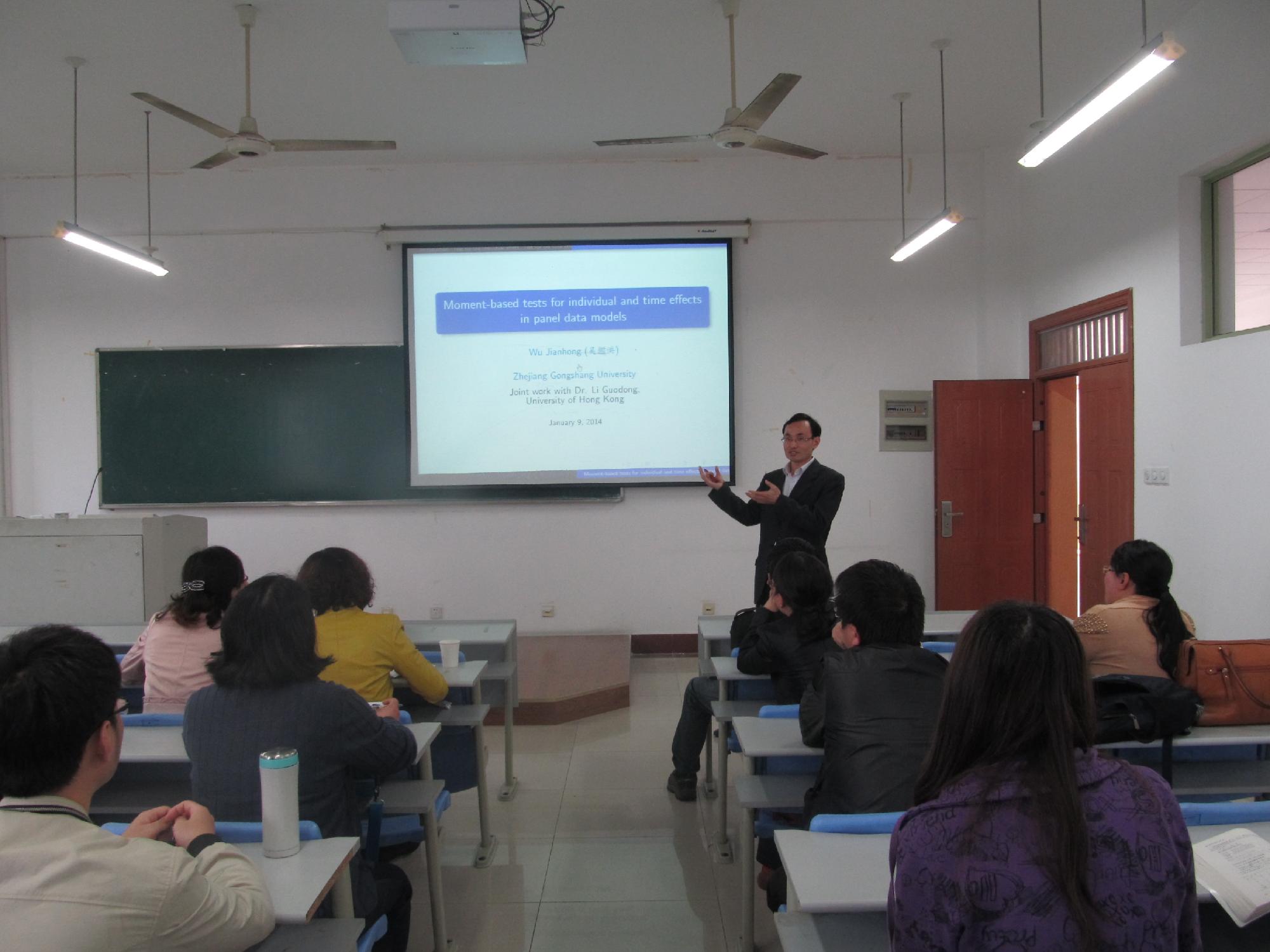 讲学,做了题为“Moment-based tests for individual and time effects in panel data models”的报告。数统学院全体研究生及部分老师参加了此次讲座。报告会由黄漫