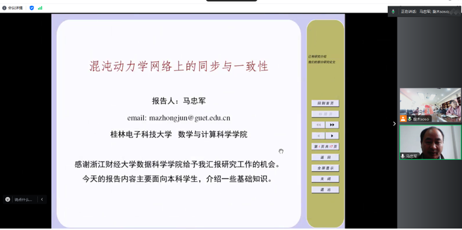 11月7日下午,桂林电子科技大学马忠军教授应邀为黄漫 师生做了一场题为“混沌动力学网络上的同步与一致性”的线上学术讲座。讲座由黄漫 王毅副教授主持,学院部分老师和研究生参加了讲座。