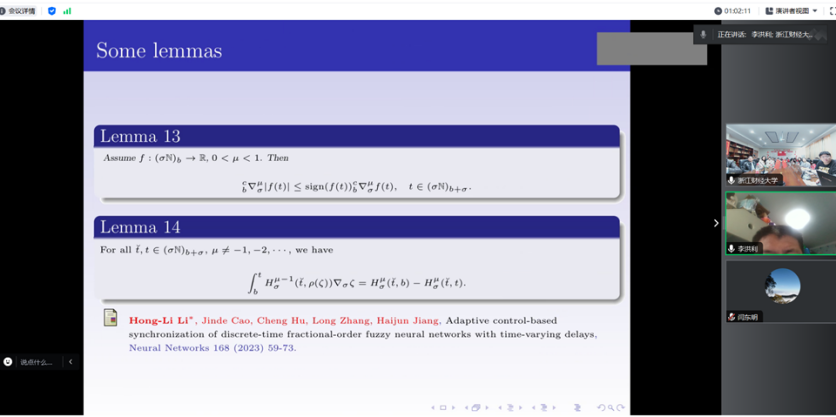 李洪利教授首先介绍了分数阶微积分的历史、相关分数阶微积分概念及发展近况,接下来指出分数阶四元值神经网络的稳定性和同步控制研究与网络科学、控制理论相互交叉,涉及到图像加密、模式识别、人工智能和自动控制等众多领域,具有广阔的研究前景和巨大的社会需求。随后,李洪利教授介绍了所在团队的最新研究成果,通过引入几类分数阶不等式及稳定性理论,来研究两类连续时间离散时间分数阶四元值神经网络多种同步问题