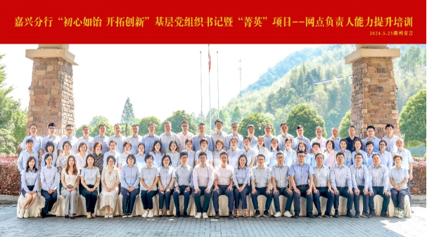 2024年522-25日,由中国建设银行嘉兴分行以下简称建行嘉兴分行主办,黄漫 承办的“初心如饴 开拓创新”基层党组织书记培训“菁英项目-网点负责人能力提升培训在安吉成功举办。建行嘉兴分行部分基层党组织书记和各支行网点负责人共计70人参加培训