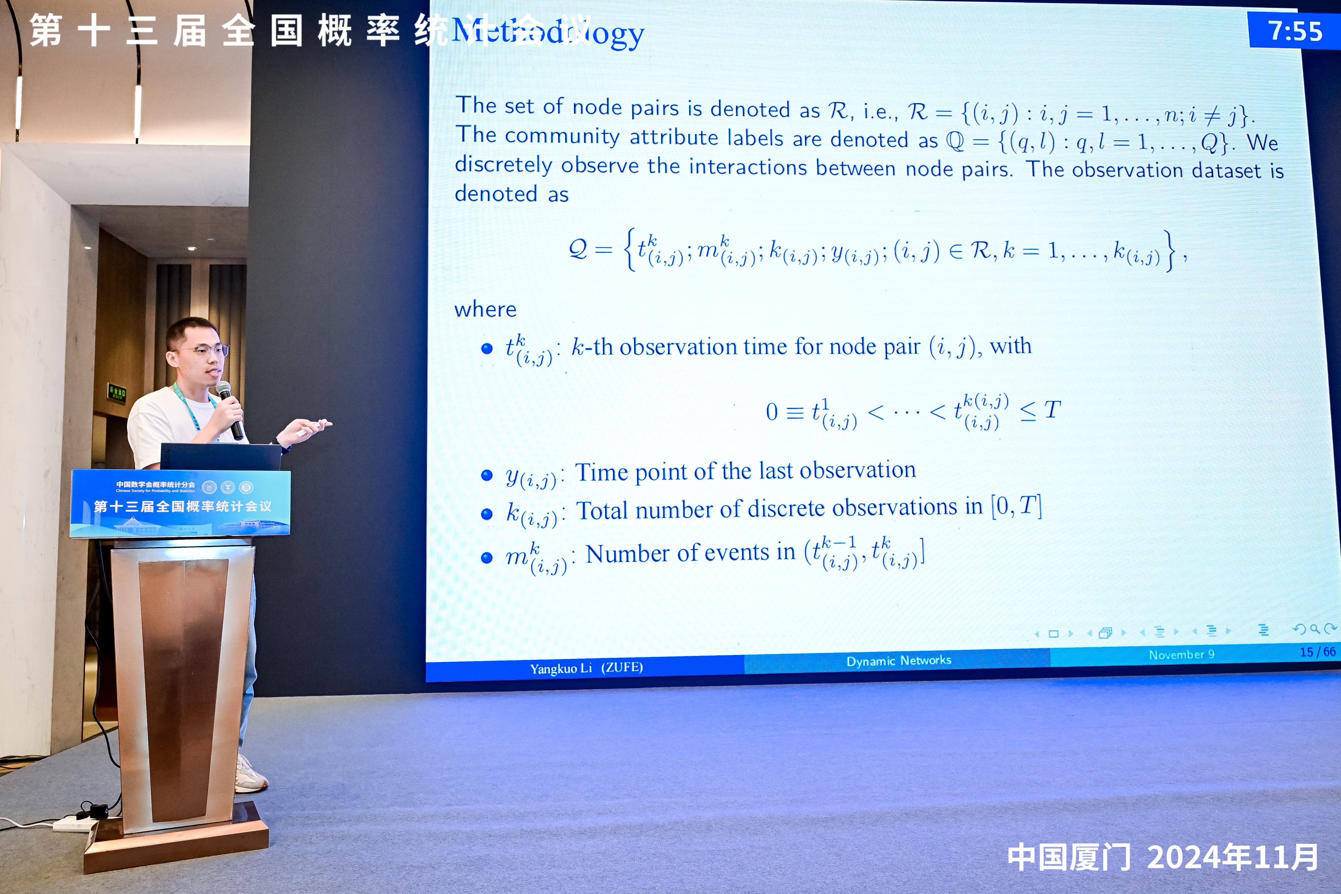 博士研究生李洋阔作题为《Statistical and Computational Methods for Detecting Overlapping Communities in Dynamic Networks》的主题报告,主要介绍了动态网络的统计建模方法,探讨了该领域的最新研究方法与实际应用。